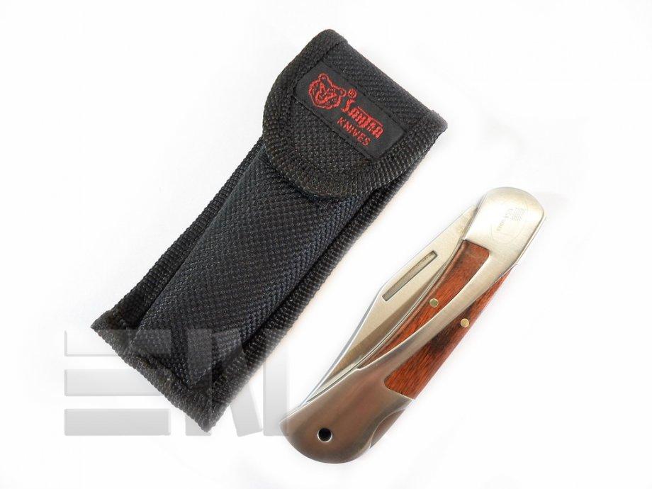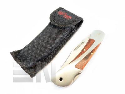 Džepni preklopni kamping nož Sanjia L USA Sabre , dimenzija: zatvoreni 11 cm, rasklopljeni nož 19,5 cm, oštrica noža 8,8 cm, izrađen od nehrđajućeg čelika, drška noža izrađena u kombinaciji poliranog nehrđajućeg čelika i egzotičnog drva, nož posjeduje blokadu protiv zatvaranja, Nož dolazi sa crnom nylon futrolom koja se može staviti na remen, odličan i neophodan alat za boravak u prirodi.