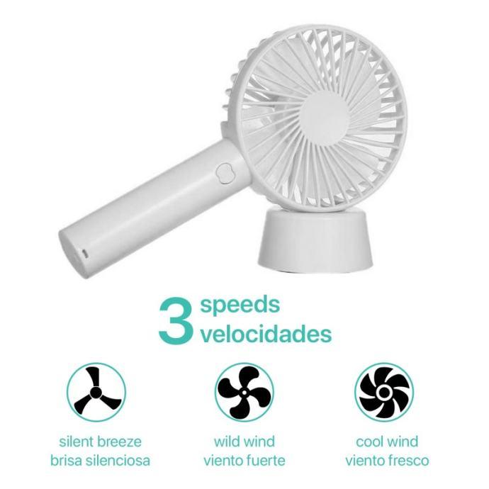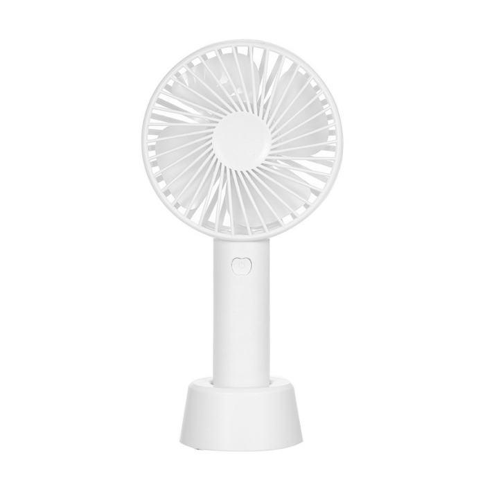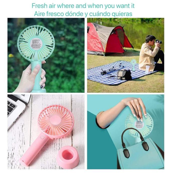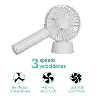 Prijenosni mini ventilator s punjivom baterijom i stolnom bazom. • Punjiva litijeva baterija. Kompatibilan s USB priključkom, punjiv preko izlaznog adaptera od 5 V, također se može puniti putem USB-a/punjača za prijenosno računalo/punjača za automobile i drugih uređaja s omogućenim USB-om. • USB električni ventilator izrađen od visokokvalitetnog ABS-a, čvrste strukture otporne na pritisak. Savršeno za unutarnje prostore - ured, dom, spavaća soba, radna soba, knjižnica, igraonica ili aktivnosti na otvorenom - plaža, piknici, sportski događaji, kampiranje, planinarenje, biciklizam, penjanje, vožnja čamcem, putovanja i više. • 3 brzine: lagani vjetar, prirodni vjetar i jak vjetar. Ventilator s 3 postavke brzine protoka zraka može se prilagoditi prema vašim potrebama. Podesite odgovarajuću brzinu ventilatora uzastopnim pritiskom na tipku za napajanje. • Možete ga držati u ruci, staviti na stol kao stolni ventilator zahvaljujući njegovoj odvojivoj bazi. • Tiho: Proizvodi snažan povjetarac s manje buke (između 20 i 30 dB).