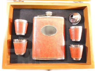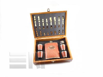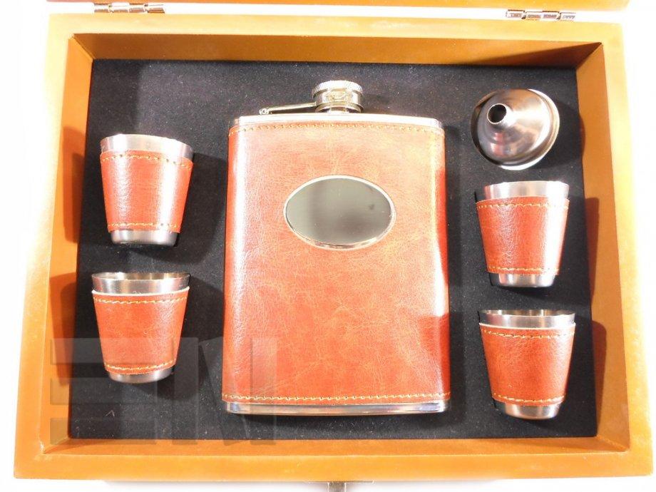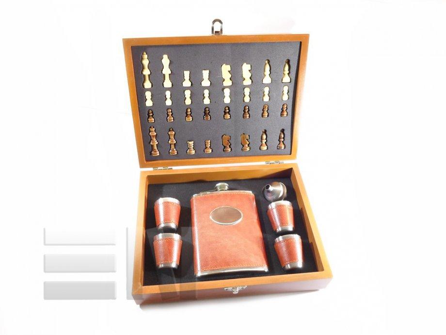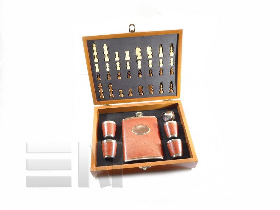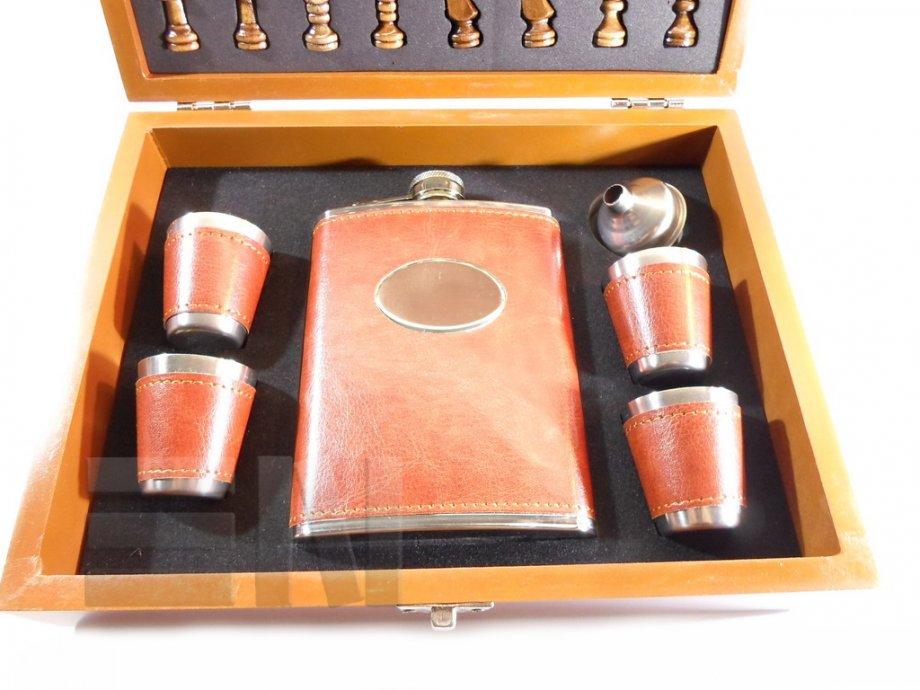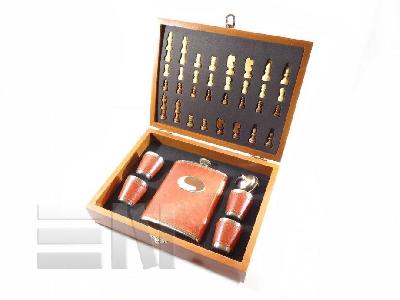 Poklon šah/ploska set u drvenoj kutiji sa ploskom i čašicama obućeni u smeđu kožu.