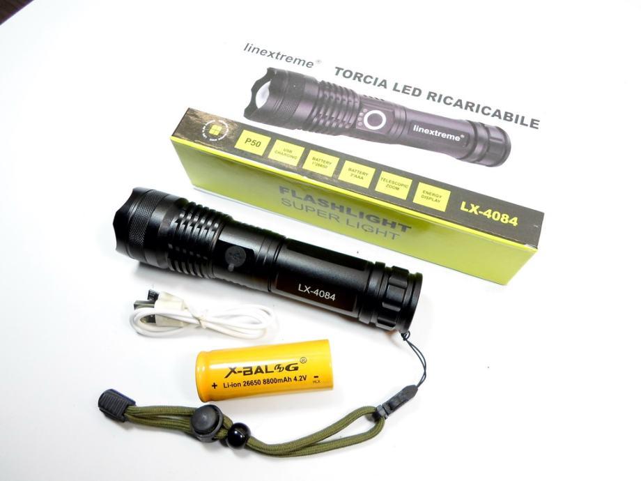 USB Punjiva Led Svjetiljka P50 Linextreme LX4084, USB - micro , zoom - ručna, punjiva, univerzalna, pogodna za svakodnevnu upotrebu i za planinarenje, lov, ribolov, općenito boravak u prirodi. Baterijska svjetiljka jako svijetli snažnim ujednačenim svjetlosnim tokom, domet joj je nekoliko stotina metara.
