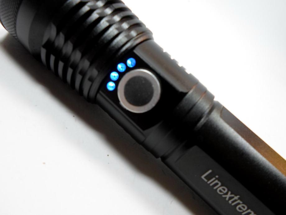 Ima LED indikator na fizičkom prekidaču svjetiljke, 4 plave led diode koje prikazuju stanje napunjenosti akumulatora( 100%-75%-50%-25%)