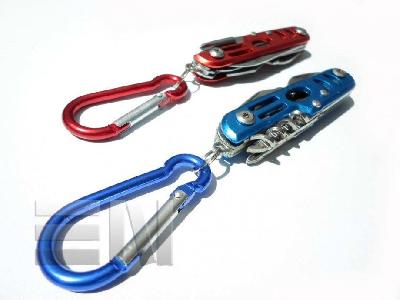 višenamjenski kamping nožić s karabinerom 8 funkcija: nož, škarice, pila, otvarač konzervi, odvijač, odvijač križni, otvarač metalnih čepova flaša, špica, otvarač plutanih čepova, dimenzija: zatvoreni 7,5 cm, rasklopljeni nož 12,5 cm, oštrica noža 5 cm, odličan i neophodan alat za boravak u prirodi.